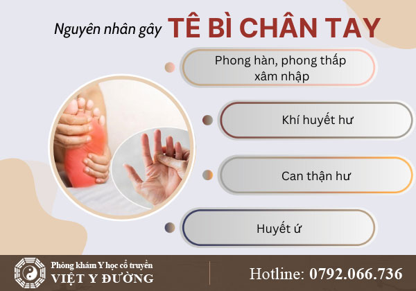 Theo Đông y, tê bì tay chân xuất phát từ khí huyết ứ trệ, phong hàn xâm nhập hoặc tạng phủ suy yếu. Điều trị tập trung vào việc khai thông kinh lạc, hoạt huyết, bổ khí huyết và cân bằng âm dương.