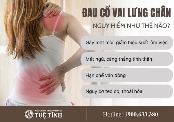 Đau cổ vai lưng chân là tình trạng đau nhức tại nhiều vị trí cơ xương. Tình trạng này thường xuất hiện âm ỉ hoặc đột ngột tùy cơ địa. Người bệnh có thể bị đau lan tỏa, ảnh hưởng đến vận động hằng ngày.