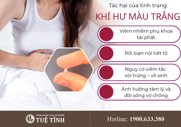 Khí hư trắng bất thường thường xuất hiện khi cơ thể mất cân bằng hormone. Sự rối loạn này khiến da sạm, nổi mụn, kinh nguyệt thất thường và giảm ham muốn tình dục. Nếu kéo dài, nội tiết càng suy yếu, gây rối loạn chức năng sinh lý nữ.